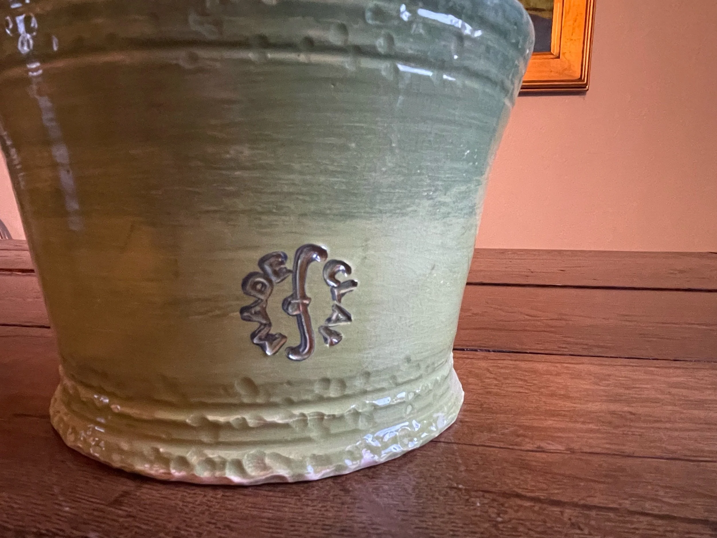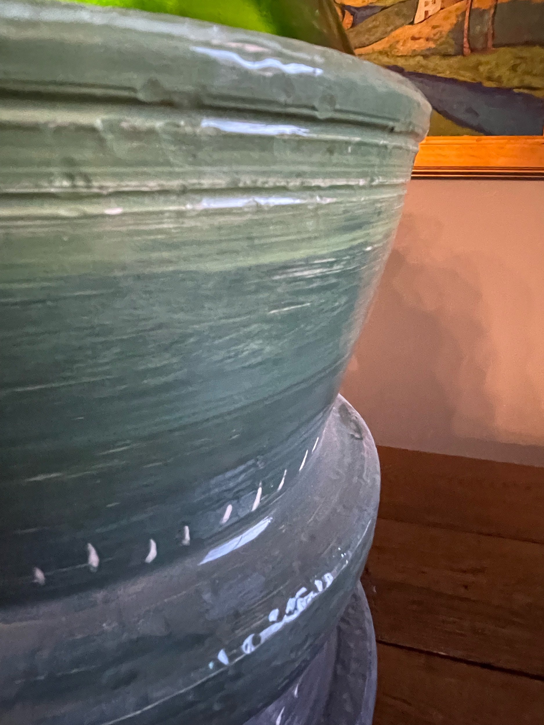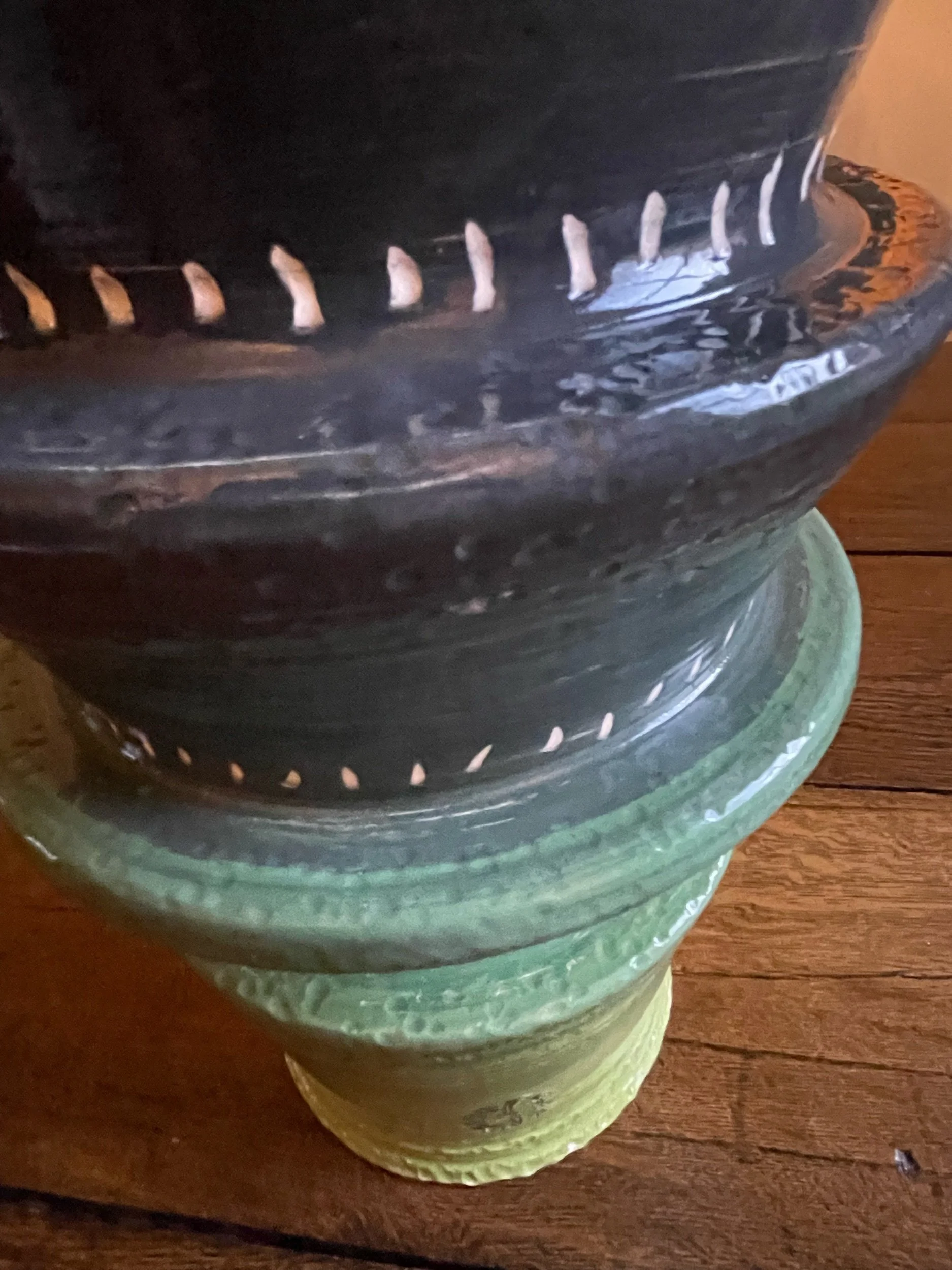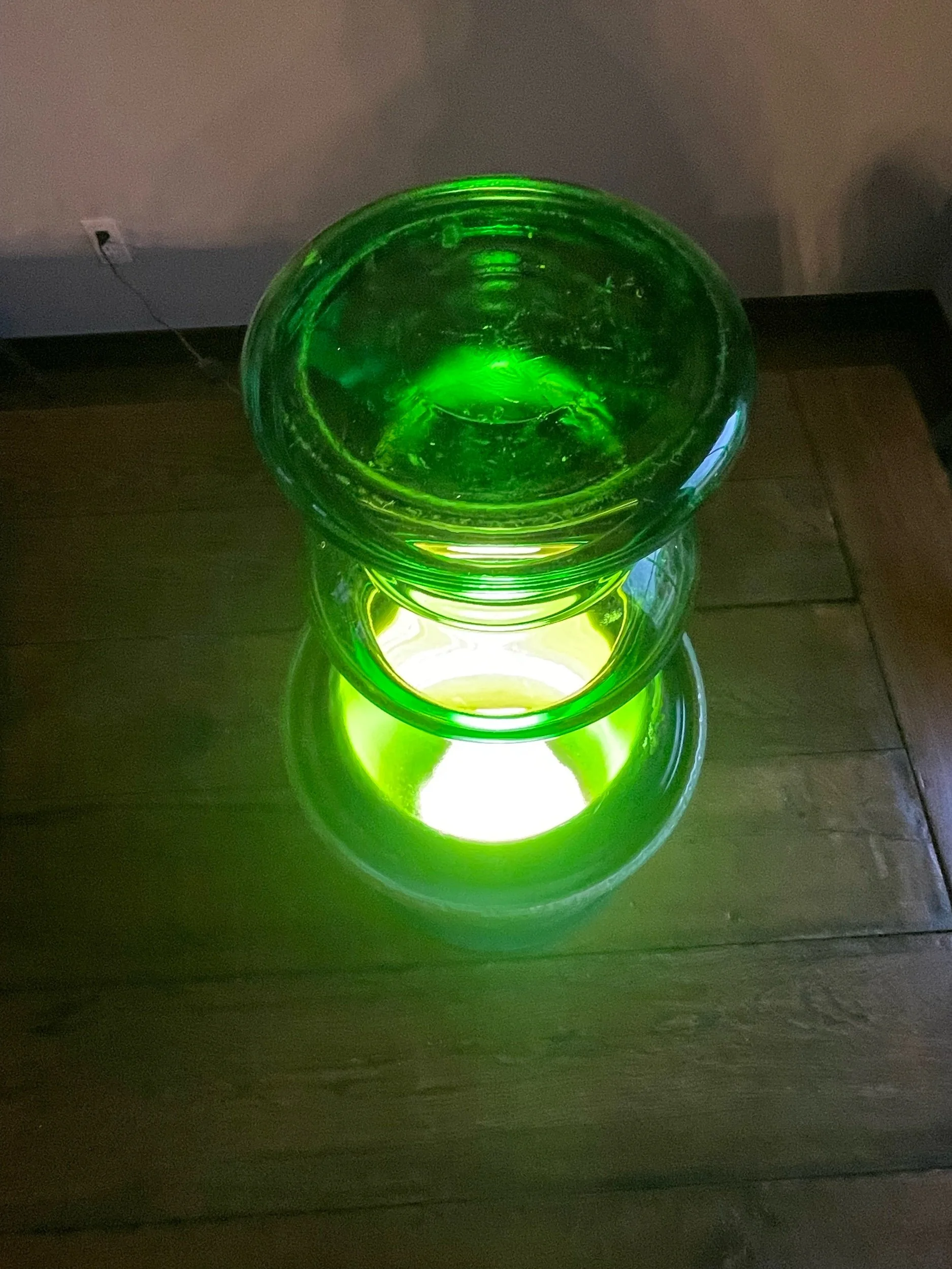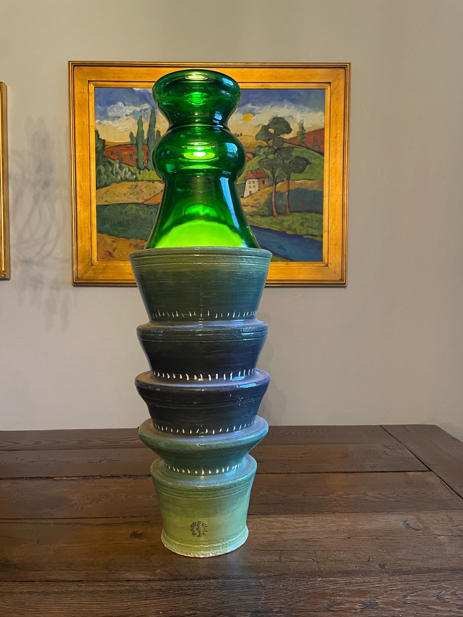 This unconventional table lamp was inspired by the unique glass vessel I found at an antique shop. The multi-tiered base rises almost two feet to meet the inverted glass. Internally lit, it casts an upward green glow.